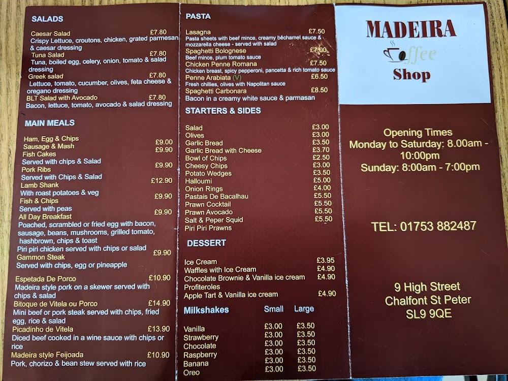 Madeira Restaurant sits at 9 High St in Chalfont Saint Peter, right in the heart of the charming Gerrards Cross area. This café has successfully created a fusion of Portuguese and English cuisines, catering to a diverse clientele. With its casual and cozy atmosphere, it welcomes families, groups, and tourists alike, offering something for everyone throughout the day. Its location adds a touch of charm, making it easy to pop in for a snack after exploring the local shops. The restaurant prides itself on a commitment to quality, with dishes made fresh from locally sourced ingredients.